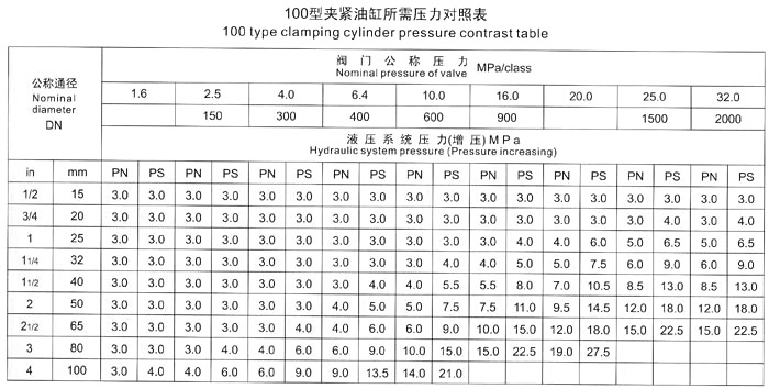 五、測試閥門時(shí),首先根據(jù)被試閥門試驗(yàn)壓力,要求參照《壓緊油缸所需壓力對照表》中液壓壓緊系統(tǒng)壓力值,進(jìn)行增壓壓力調(diào)節(jié),嚴(yán)禁增壓壓力值超高、防止被試閥門變形損壞。