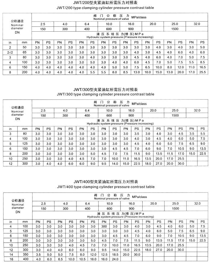 根據(jù)被試閥門公稱通徑和公稱壓力,調(diào)節(jié)電接點壓力表和被試閥門壓力相同。參照《壓緊油缸所需壓力對照表》將壓緊油缸壓力增壓到所需壓力要求。 (注:增壓按鈕可要多次點動,每次按動相隔時間需在5-10秒鐘左右)。