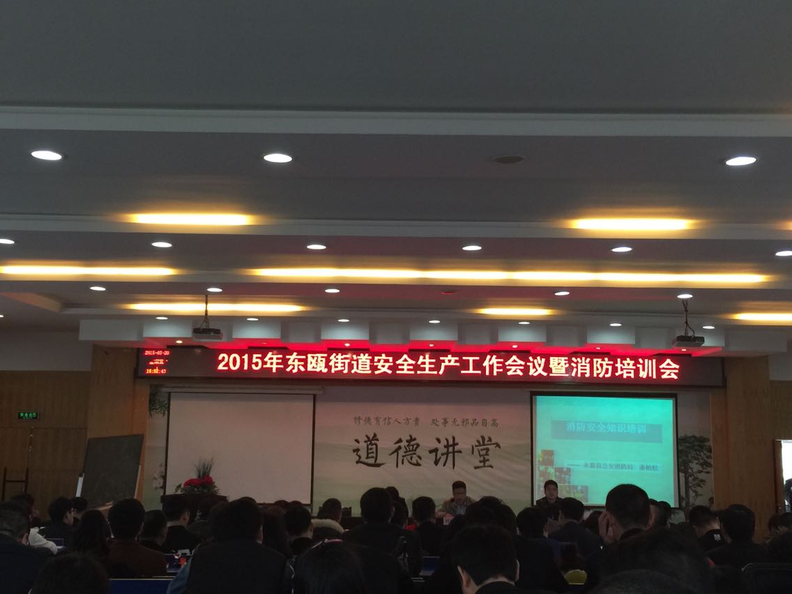 3月21日東甌街道(永嘉東甌工業(yè)園區(qū))安全生產(chǎn)工作會議暨消防培訓會在東甌工業(yè)園區(qū)舉行,本次會議有東甌街道黨委副書記主任杜國平主持,工業(yè)園區(qū)副主任做去年工作報告和今年的工作重點,園區(qū)副書記朱琳哲重點對消防的重要性、消防預防步驟、事故案例等做了詳細的介紹和分析,并囑咐個企業(yè)負責人和主管部門嚴把安全生產(chǎn)關,定期做安全檢查,對達不到安全生產(chǎn)標準的部門和企業(yè)馬上整改,做到萬無一失。