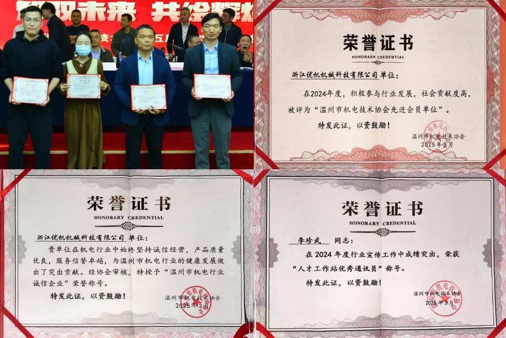 3月26日,在溫州市機(jī)電技術(shù)協(xié)會(huì)五屆三次會(huì)員大會(huì)上,浙江優(yōu)機(jī)機(jī)械科技有限公司憑借卓越表現(xiàn),榮獲2024年度"溫州市機(jī)電行業(yè)誠(chéng)信企業(yè)"和"溫州市機(jī)電技術(shù)協(xié)會(huì)先進(jìn)單位"兩項(xiàng)榮譽(yù)稱號(hào)。公司總經(jīng)理李珍武同時(shí)獲評(píng)"機(jī)電協(xié)會(huì)人才工作站優(yōu)秀通訊員"稱號(hào)。